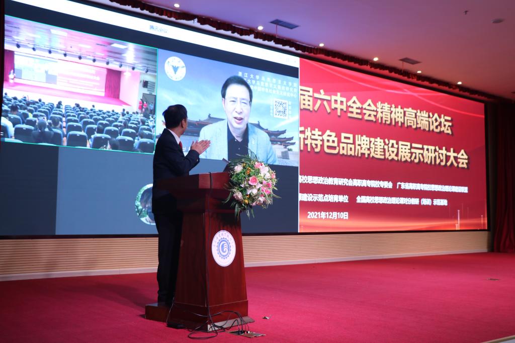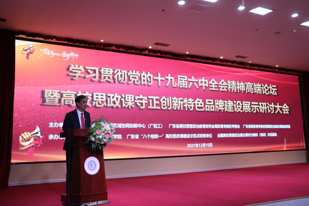 为学习贯彻党的十九届六中全会精神,深入落实《关于加强新时代马克思主义学院建设的意见》、《关于深化新时代学校思想政治理论课改革创新的若干意见》等文件精神,进一步推进思政课改革创新,提升思政课教学实效,打造思政课建设特色品牌项目,12月10日,由广东省高校思政课区域协同创新中心(广轻工)、广东省高等学校思想政治教育研究会高职高专思想政治教育专业委员会、广东省高职高专院校思想政治理论课建设联盟主办,广东机电职业技术学院承办的学习贯彻党的十九届六中全会精神高端论坛暨高校思政课守正创新特色品牌建设展示研讨大会顺利召开。