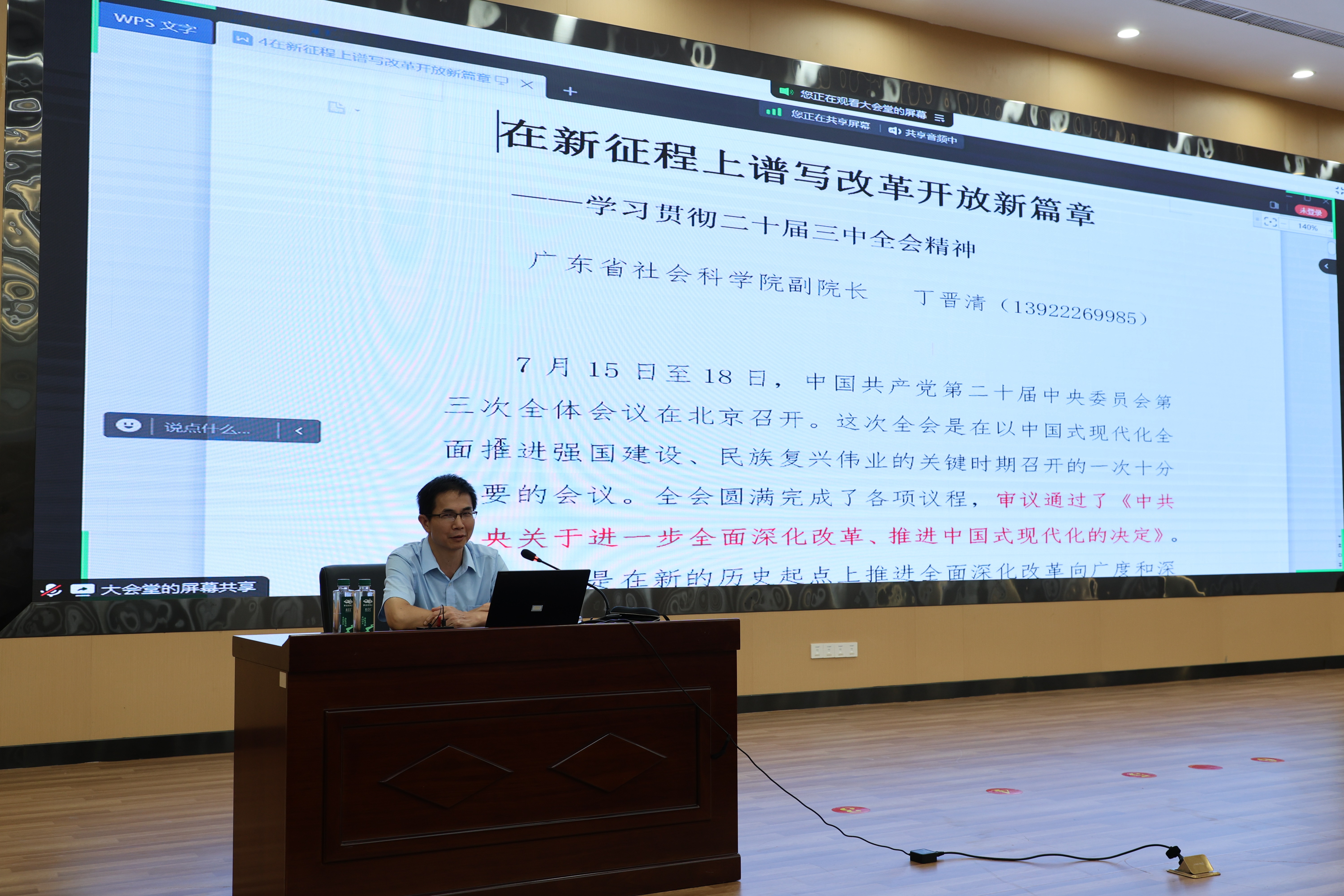 活动分两阶段进行。首先由中央马克思主义理论研究和建设工程首席专家,广东省社会科学院党组成员、副院长丁晋清以《在新征程上谱写改革开放新篇章》为主题作学习贯彻党的二十届三中全会精神专题辅导报告。丁晋清指出,习近平总书记在党的二十届三中全会上提出的新思想、新观点、新战略,不仅是对国家发展的深远谋划,也是对我们教育领域深化改革、创新发展的根本指引。在新时代背景下,教育应当聚焦如何更好地服务于中国式现代化全局。报告主题鲜明、重点突出、内容丰富、逻辑性强,具有很强的理论性和指导性,对全体与会人员进一步学习领会党的二十届三中全会精神具有积极的启发作用,为全体思政课教师切实把党的二十届三中全会精神融入到日常思政课教学中提供了有力的实践指导。