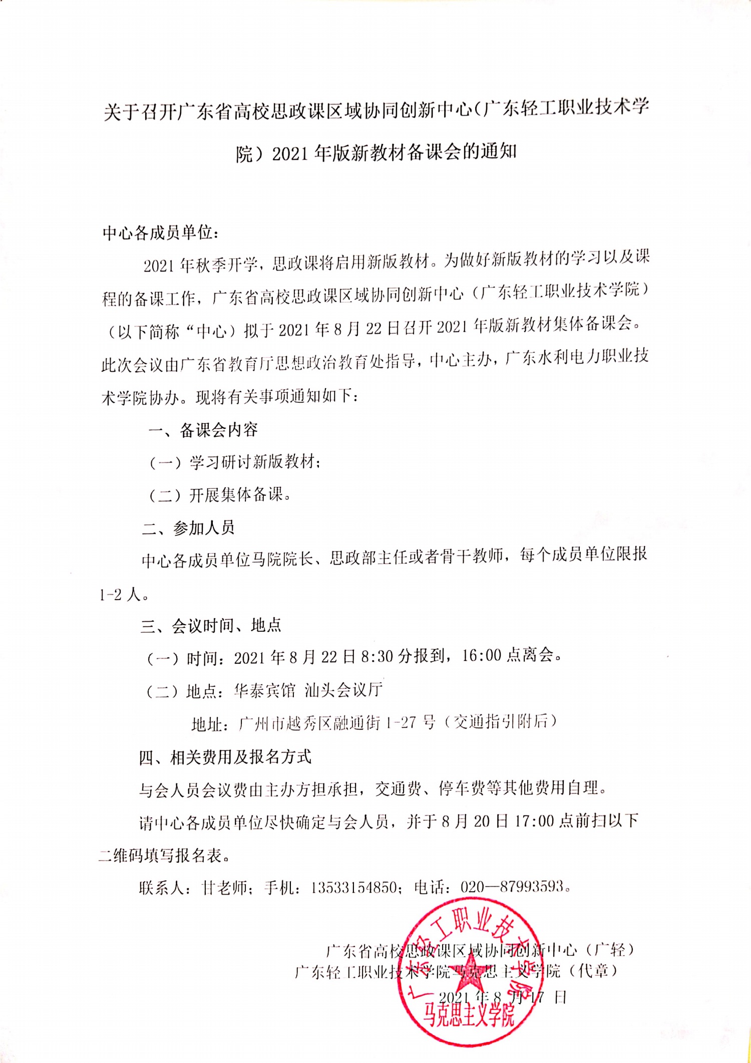 关于召开广东省高校思政课区域协同创新中心(广东轻工职业技术学院)2021年版新教材备课会的通知