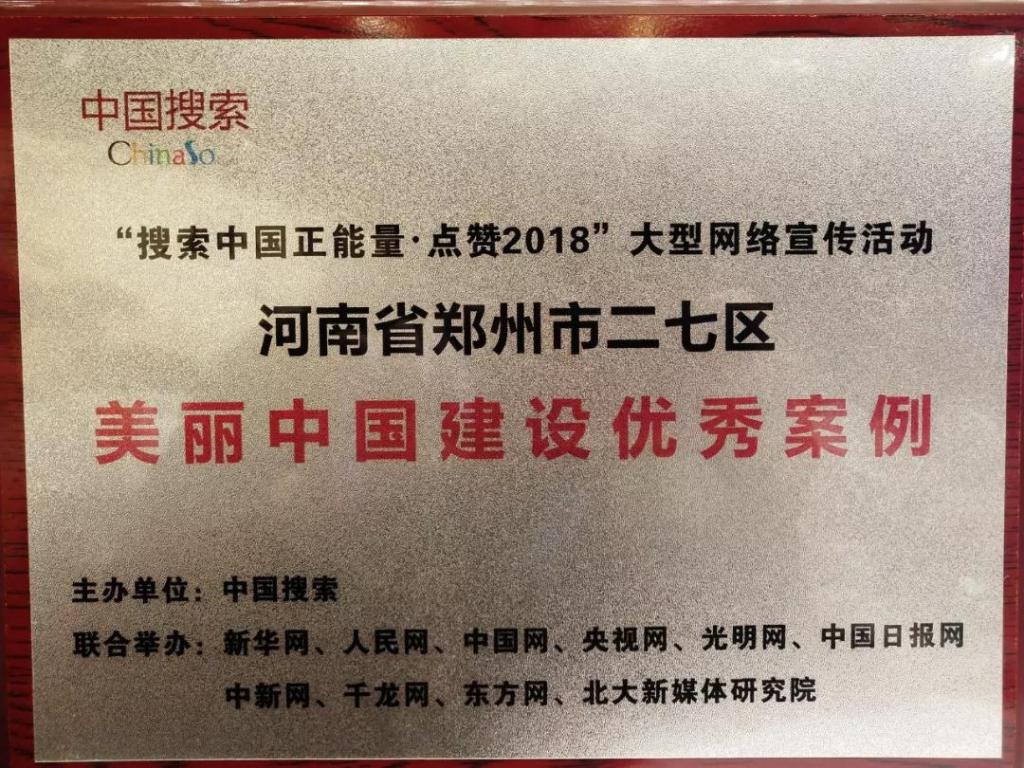 1月22日,由“中国搜索”联合人民网、新华网、中国网、央视网、光明网、中国日报网等中央地方重点新闻网站共同举办的“搜索中国正能量·点赞2018”揭晓典礼在北京举行,活动通过对互联网、移动互联网海量大数据的采集和热搜词分析,多渠道案例征集,组织专家投票评审等一系列严格规范的环节产生评选结果。二七区在评选中脱颖而出,荣获首批美丽中国建设优秀案例。