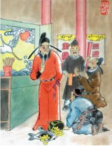 第二天,县衙门外挤满了看热闹的百姓。白居易升堂后问道:“你们哪个先讲?”赵乡绅抢着说:“大人,我的理(鲤)长,我先讲。”李财主也不甘示弱说:“我的理(瓜)大,该我先讲。”白居易沉下脸说:“什么理长理大?成何体统!”赵乡绅以为县太爷忘了自己送的礼,连忙说:“大人息怒,小人是个愚(鱼)民啊!”白居易微微一笑说:“本官耳聪目明,用不着你们旁敲侧击,更不喜欢有人暗通关节。来人,把贿赂之物取来示众。”