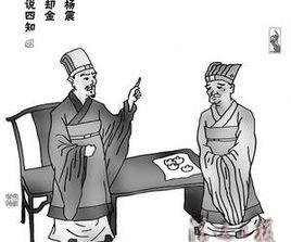 东汉杨震暮夜却金。东汉时,杨震在赴任途中经过昌邑时,昌邑县令王密来拜访他,并怀金十斤相赠。杨震说:”故人知君,君不知故人,何也?”王密没听明白杨震的责备之意,说: “天黑,无人知晓。”杨震说:“天知,神知,你知,我知,何谓无知?”王密这才明白过 来,大感惭愧,怏怏而去。