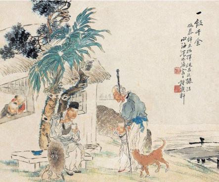 韩信在城下垂钓,有很多老婆婆在河边漂洗衣物,其中有一位老婆婆看见韩信忍饥挨饿,便把饭给韩信吃,直到数十天后漂洗完毕。韩信很高兴,对漂洗衣物的老婆婆说:“我一定会有重重答谢您的机会。”漂洗衣物的老婆婆生气地说:“身为大丈夫不能自己养活自己,我可怜你因而送给你吃的,难道期望你报答吗?”大汉五年正月,(汉高祖刘邦)改封齐王韩信为楚王,建都于下邳,韩信到了封地,召见曾分给他饭吃老婆婆,赏给她千金。