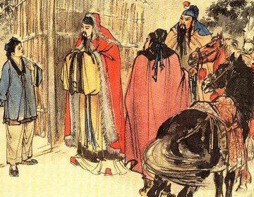 官渡大战后,曹操打败了刘备。刘备只得投靠刘表。曹操为得到刘备的谋士徐庶,就谎称徐庶的母亲病了,让徐庶立刻去许都。徐庶临走时告诉刘备,卧龙岗有个奇才叫诸葛亮,如果能得到他的帮助,就可以得到天下了。第二天,刘备就和关羽、张飞带着礼物,去南阳拜访诸葛亮。谁知诸葛亮刚好出游去了,书童也说不准什么时候回来。刘备只好回去了。过了几天,刘备和关羽。张飞冒着大雪又来到诸葛亮的家。刘备看见一个青年正在读书,急忙过去行礼。可那个青年是诸葛亮的弟弟。他告诉刘备,哥哥被朋友邀走了。刘备非常失望,只好留下一封信,说渴望得到诸葛亮的帮助,平定天下。转眼过了新年,刘备选了个好日子,又一次来到卧龙岗。这次,诸葛亮正好在睡觉。刘备让关羽、张飞在门外等候,自己在台阶下静静地站着。过了很长时间,诸葛亮才醒来,刘备向他请教平定天下的办法。诸葛亮给刘备分析了天下的形势,说:“北让曹操占天时,南让孙权占地利,将军可占人和,拿下西川成大业,和曹、孙成三足鼎立之势。”刘备一听,非常佩服,请求他相助。诸葛亮答应了。那年诸葛亮才27岁。