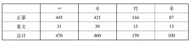 形声字的大量产生大约在周秦时代。和象形字不同,形声字的文化信息不是存在在个体汉字的总体取象里,而是集中在它的义符里。形声字的义符反映了它所记录的词意义的类别,是一种比较概括的取象。《说文》小篆反映的是五经的词义,因此,也就反映了周秦时代的文化。在汉字构形上,小篆对形声字的义符进行了规整,义符系统反映了当时的文化信息。“草木竹禾”是《说文解字》中表示植物的四个大部首。它们所辖字的总数达 1195 字,约占《说文解字》总字数的12% ,四大部首所从字的数量如下表: