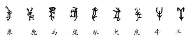 这些四足动物,文字的取象如果粗疏了,很难加以分辨。在比较中可以看到其中的构意——象突出长鼻,鹿突出两角,马突出奔跑时竖起的鬃毛,虎突出身上的花纹和张开的虎口,豕(猪)突出大腹,犬(狗)突出向上卷起的尾巴,鼠以碎食物突出其觅食的行为。只有牛羊只描绘头部,为了区别,牛角向上翘起,羊角向下弯曲。我们把这些构形类聚在一起,可以得到一个很重要的文化信息:汉字处在表形文字阶段时,人类的生活与动物的关系还十分密切,不但对野生动物的驯兽能够细微观察,就是对一些猛兽也有近距离接触的生活经验。在甲骨文中,取象于动物的形体十分丰富,显然是狩猎生活在文字构形上的反映。