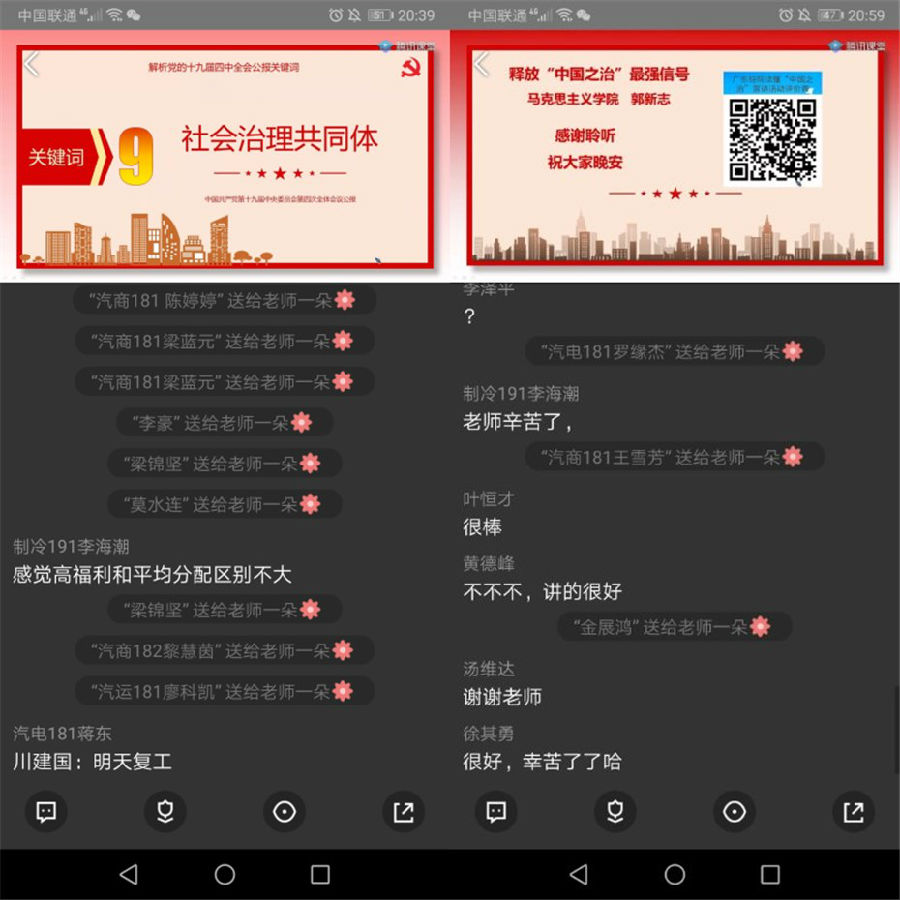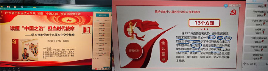 本学期宣讲活动由马克思主义学院党总支承办,副书记余展洪教授携20位思政课专任老师以线上直播或录播方式共开展宣讲,做到全校10个二级学院全覆盖。从本月24日起共宣讲25场,截止2020年4月28日,已完成10场宣讲活动,来自艺术设计学院、信息学院等二级学院4000余名学生聆听了讲座。目前学生好评率超过98%。其中,艺术设计学院广告192的洪培基同学在听完王浩副教授的宣讲后说:“老师讲的课很到位,平时我不怎么爱听历史。但这次听了王浩老师讲的让我热血沸腾,想马上为祖国做出奉献的感觉!”轻化工技术学院高分子193蔡锦洪同学听完陈爱华老师课后说:”听了这次讲座,我更加直观的认识到我们国家的强大,也明白了西方国家和我们国家法制上的根本区别,更加坚定了跟党走的信念。”艺术设计学院服装182严晓婷同学在听完胡冰副教授的课后说:“一要充分认识我国国家制度和治理体系的显著优势,坚定不移走中国特色社会主义法治道路。二要强化责任担当,作为一名大学生,要有明辨是非的能力,肩负起自己该为社会承担的责任。三要发挥好关键少数作用,做尊崇法治的表率。坚持以人民为中心的思想。”
