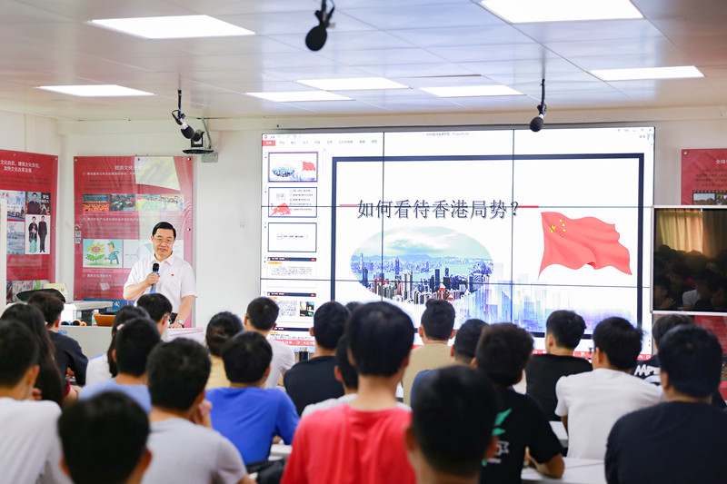 卢坤建在南海校区研练中心3304为机电181、182两个班级的学生讲授了主题为“如何看待香港局势”的思政第一课。卢坤建为同学们还原近期发生在香港的“反修例”事件,并通过真实案例分析了事件背后的深层社会根源,他教导同学们要坚定正确的政治立场,践行社会主义核心价值观,不被乱港分子所影响,一心一意专注学业,增强本领,为实现“两个一百年”奋斗目标而贡献青春力量。