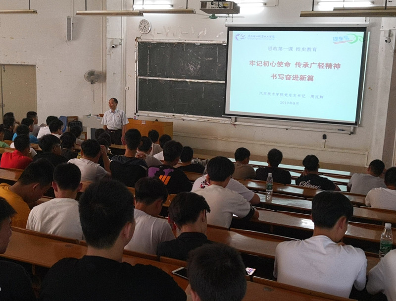 汽车技术学院党总支书记周汉辉以《牢记初心使命、传承广轻精神、书写奋进新篇——校史教育》为题,通过讲述广轻86年职教报国、职教兴国的峥嵘校史,引导同学们正确认识国家发展与学校发展、个人发展的密切关系。