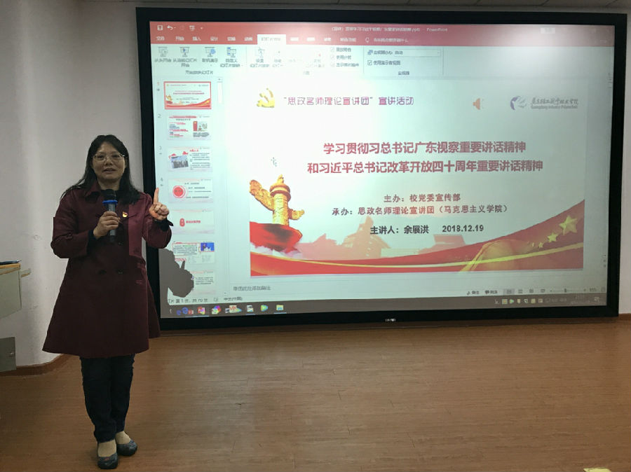 12月19日晚上广州校区宣讲会上,余展洪教授从高举新时代改革开放旗帜---习近平总书记视察广东讲话精神;改革开放40载,总结经验再出发---习近平总书记改革开放四十周年讲话精神;青年强则国强----习近平总书记寄语当代青年;知识小测验等四个部分为同学们做报告。余教授及时把18日上午习近平总书记讲话的主要精神与大家共同分享,引述了习近平总书记今年“五四北大讲话精神”激励青年学生奋发图强,扫码测验引爆全体同学们参与热情,答题正确前十名同学获得小奖励。