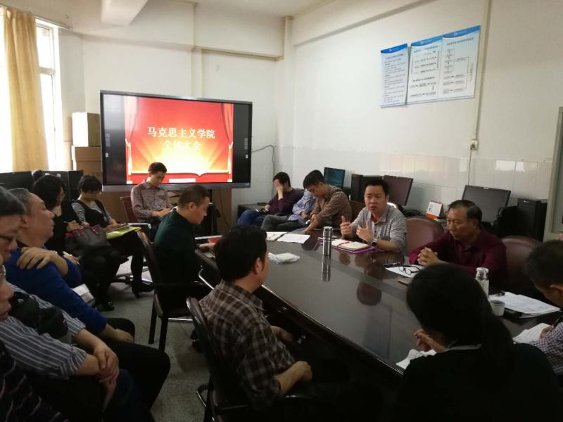 2018年3月4日上午,马克思主义学院召开新学期全体教师工作会议。会议上学院主持工作副院长李宽松传达了学校新学期的有关工作要求,并在思想、师德、纪律、教学、科研、规范、创新、党建等方面提出要求,强调新学期马克思主义学院的重点工作是“广州校区研练中心建设工作”和“十九大精神的学习与贯彻工作”,希望大家统一思想,党员同志发挥先锋模范作用,共同做好马克思主义学院的工作,为学校实现“国家优质高职院校”目标贡献我们的一份力量。之后,马克思主义学院副院长余展洪传达了学校教学例会的有关精神,对新学期马克思主义学院的教学工作进行布置安排。(文/图:吴雪涛)