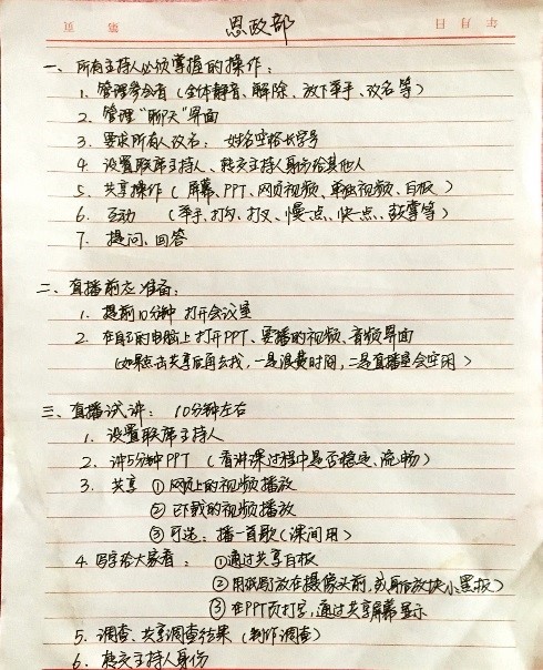 技术支持老师制作了培训流程,提前发给大家看,采用“全体老师逐一试讲—— 相互点评——技术员总结”模式开展“合格主播培训”,努力向优秀看齐。