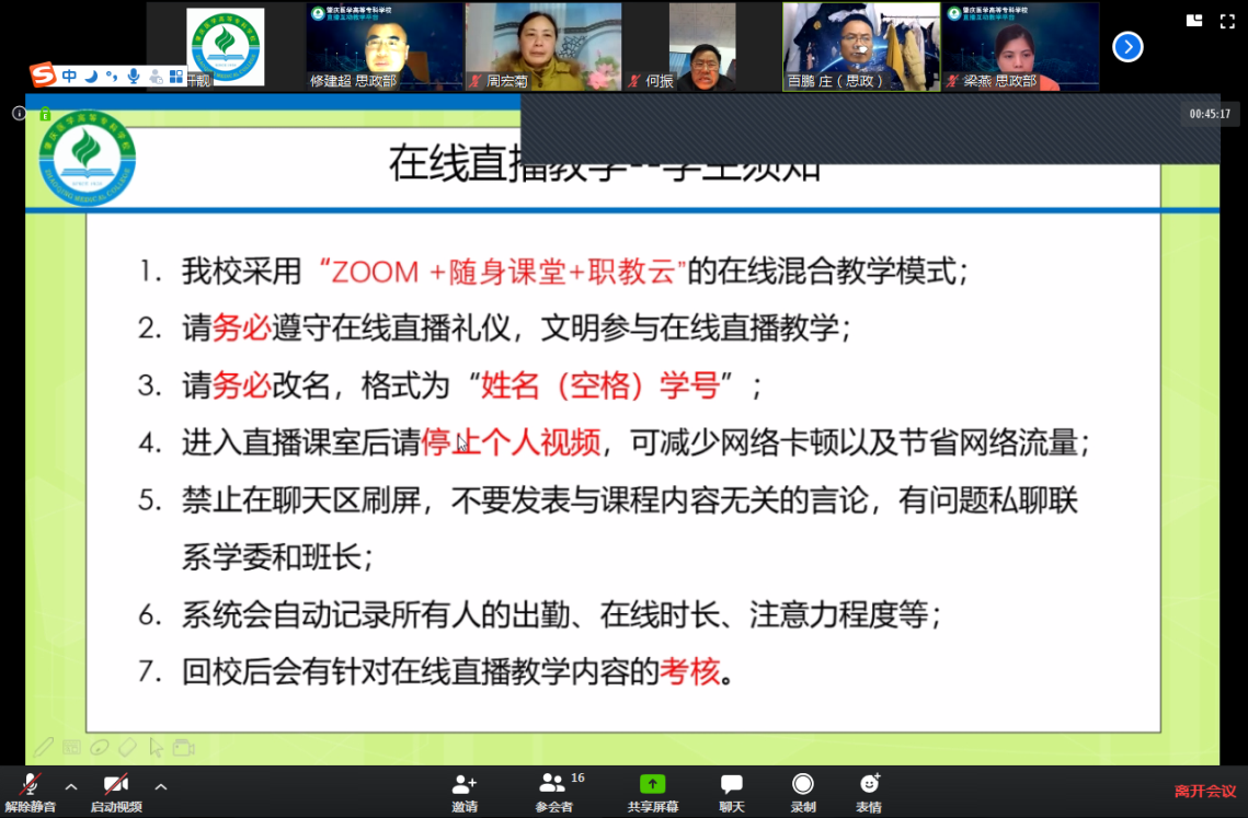 根据《教育部社科司关于加强新冠肺炎疫情防控期间高校思政课教学组织工作的通知》的文件精神和学校开展网络直播教学的工作要求。思政部认真谋划、科学施策、精心组织,充分利用Zoom直播平台好和学校随身课堂信息技术优势,全力做好疫情防控期间教学组织工作,确保质量不减、标准不降。